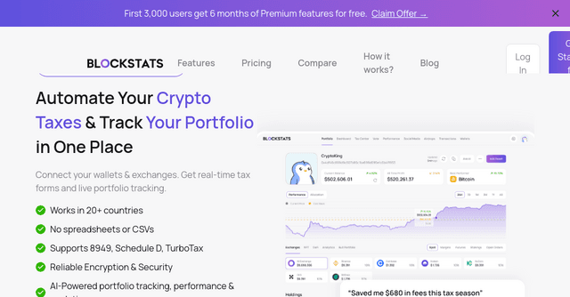 Take the first step towards simplifying your crypto taxes and portfolio management with Blockstats. Starting your free report takes under 60 seconds and requires no credit card. Plus, with our early access pricing of $49/year (regular price $99), there's never been a better time to join. Start your free report now and see why users like David Rodriguez and Sarah Chen have saved both time and money with Blockstats.