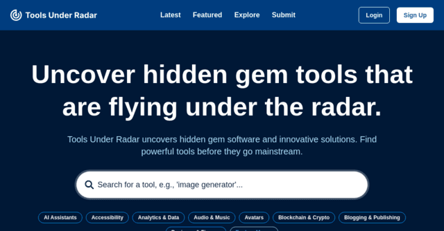 The digital world is teeming with tools and solutions designed to enhance productivity, streamline operations, and foster creativity. However, amidst the vast sea of options, many groundbreaking tools remain undiscovered. That's precisely what Tools Under Radar aims to change. By spotlighting cutting-edge software across various categories such as AI Assistants, Blockchain & Crypto, Business & Finance, and more, Tools Under Radar ensures you stay ahead of the technological curve.