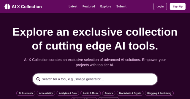 AI X Collection is more than just a marketplace for AI tools; it's a carefully curated platform that brings together the most innovative and efficient AI solutions across various sectors. Whether you're delving into AI Assistants, Accessibility, Analytics & Data, Audio & Music, Avatars, Blockchain & Crypto, Blogging & Publishing, Business & Finance, or more specialized areas, AI X Collection has something for everyone.