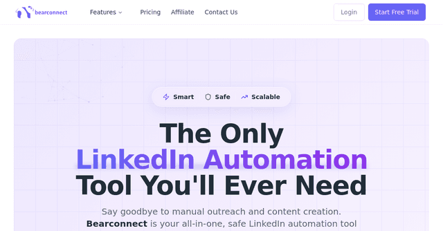 In a digital age where time is of the essence, Bearconnect offers a revolutionary solution to LinkedIn automation, ensuring professionals can focus on high-value activities without sacrificing their outreach and engagement efforts. With its smart, safe, and scalable approach, Bearconnect stands as the only LinkedIn automation tool you'll ever need. Transform your LinkedIn game, book a demo, or start your free trial today and unlock the full potential of your professional networking efforts with Bearconnect.