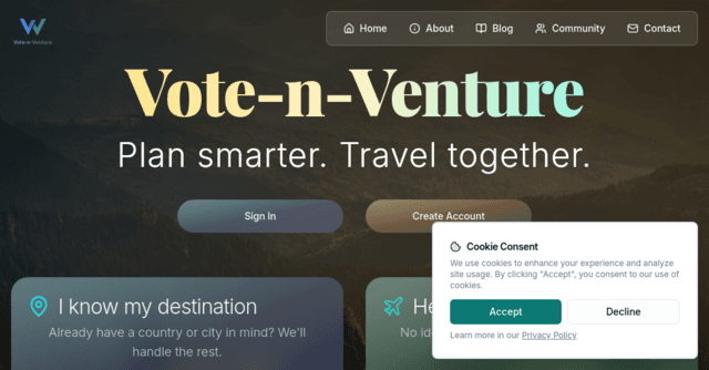 Plan smarter, travel together, and create unforgettable memories with Vote-n-Venture—where your adventures begin with a vote.